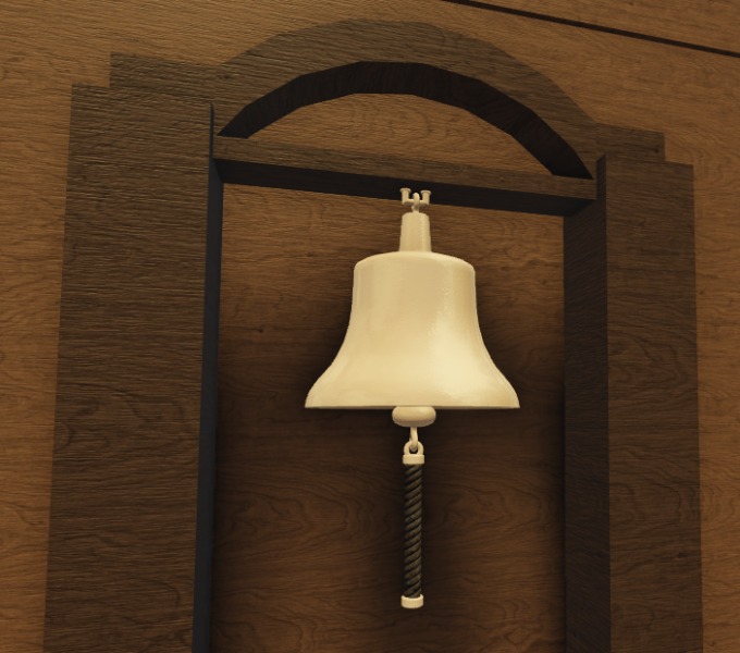 Revision as of 13:52, 30 June 2023 by Troll3274 (talk | contribs) (This bell belongs to Burkeland's mightiest ship-of-the-line, the HMS Terrapin. It is a beautiful bell that produces a deep ringing noise, used to signal crew aboard the ship. I intended on auctioning the bell along with 2 exact replicas, but the replicas looked so much like the real thing that I couldn't tell them apart!. As a result, the winner of each bell will receive a certificate of authenticity from the auction house verifying that they own the real bell. Happy bidding!)